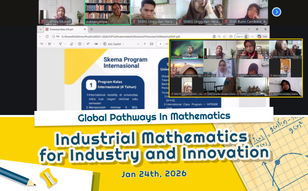 The Department of Mathematics FMIPA UGM, once again held a socialization event for its international programs through a webinar entitled “Global Pathways in Mathematics and Statistics” on Saturday (24/1). Conducted online via Zoom Meeting from 09:00 to 12:00 WIB, the event was attended by hundreds of participants from diverse backgrounds. ...