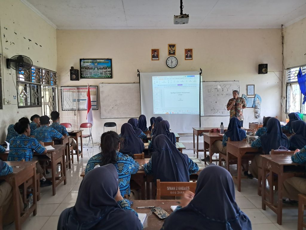 The Community Service Team (PkM) of the Department of Mathematics, chaired by Dr. Sutopo, M.Si., in collaboration with the Mathematics Teachers’ Working Group (MGMP) of Brebes Regency High Schools, successfully held an event entitled Refreshing Several Lesson Materials Series 4 on Wednesday, October 8, 2025, at Brebes 2 Public High School. This PkM event was titled “Welcoming TKA with Joy: Brebes Regency Senior High School Mathematics MGMP Learning Together with UGM.” The event was held in parallel and was attended by 56 mathematics teachers from various senior high schools in Brebes Regency and 35 12th grade students from Brebes 2 Senior High School.